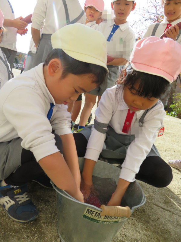 お友達と一緒にお芋をゴシゴシ洗うよ。きれいになったかな~?